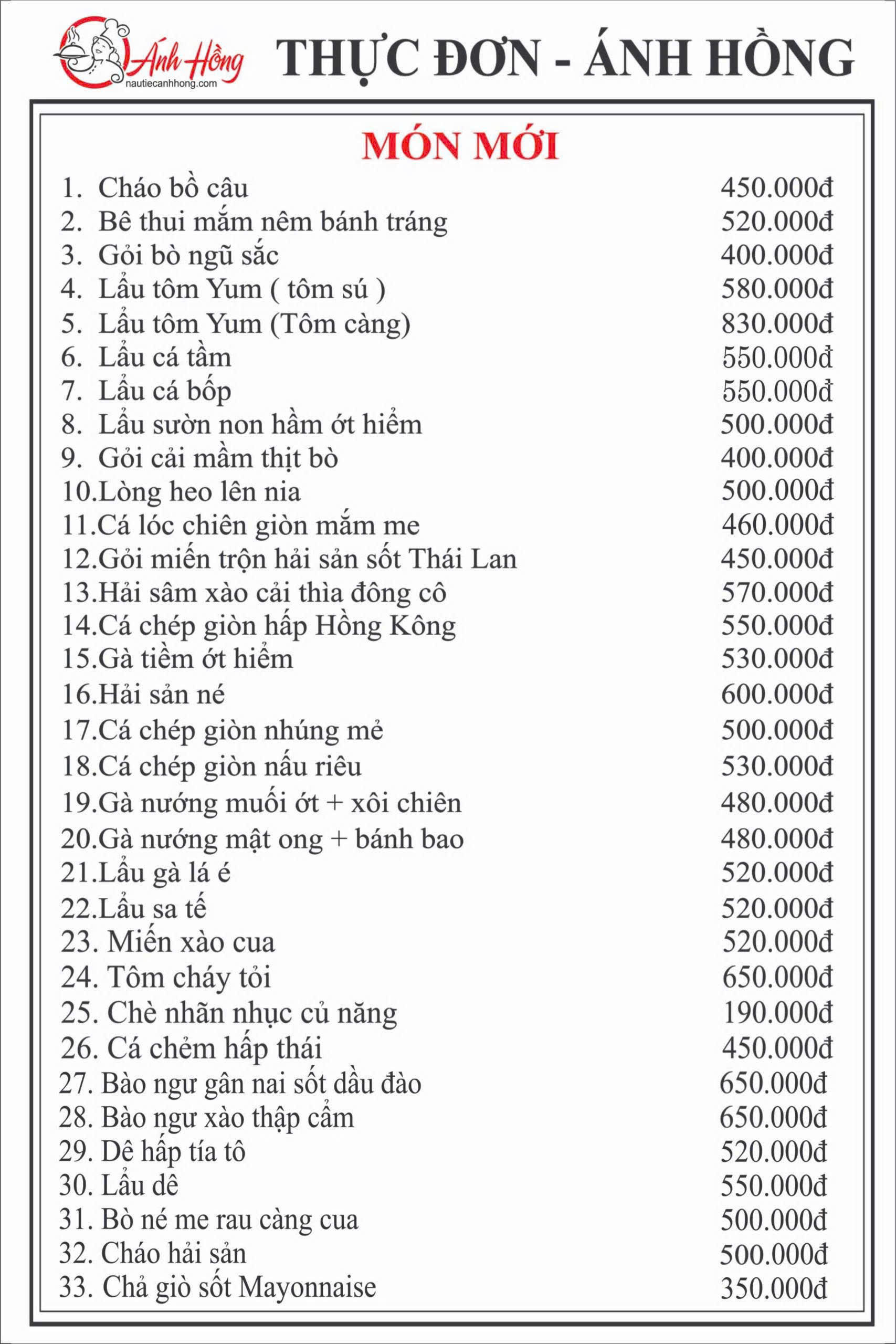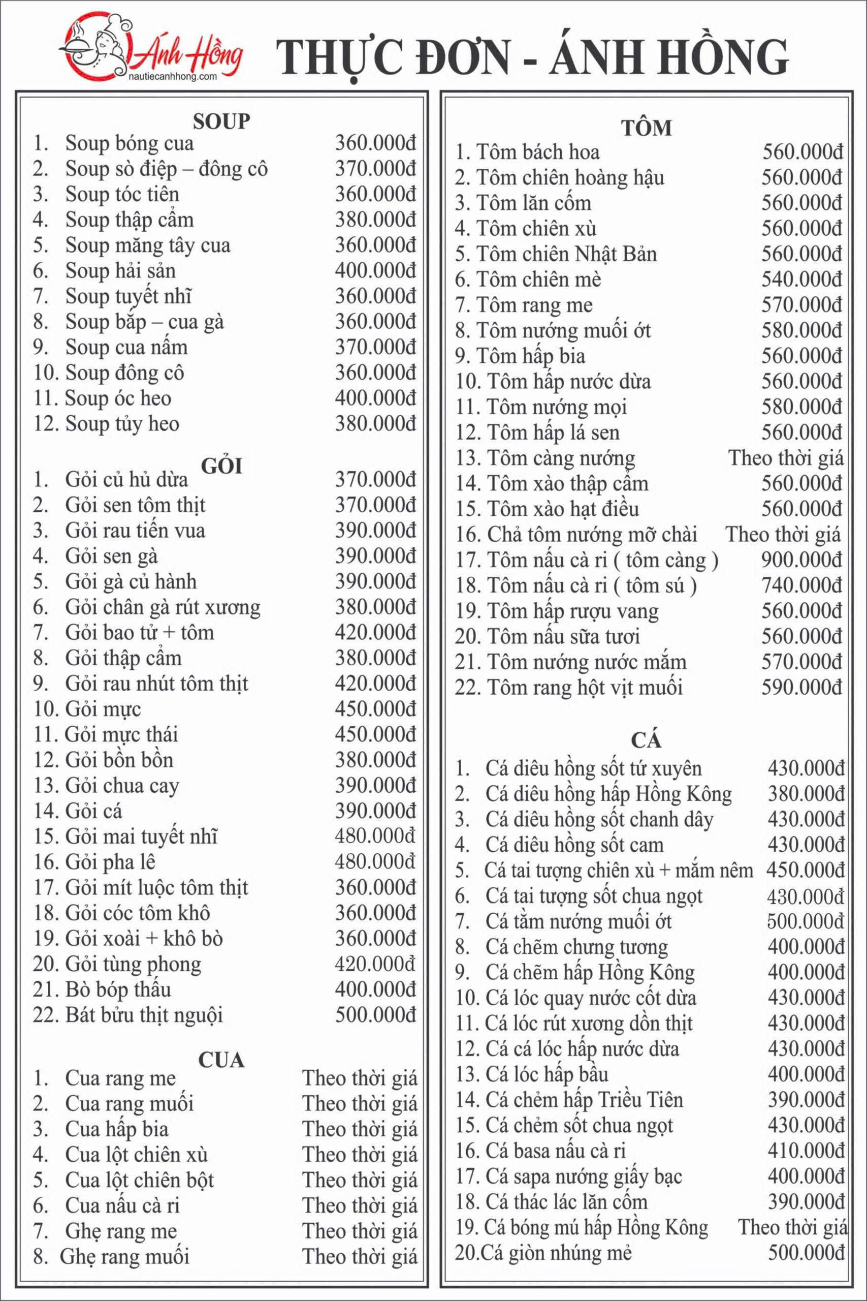 BẢNG GIÁ THỰC ĐƠN NẤU TIỆC ÁNH HỒNG